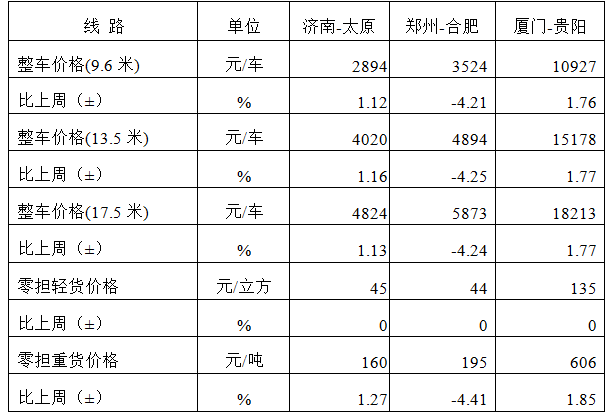 表1 本周部分線路平均價格及環比情況對比