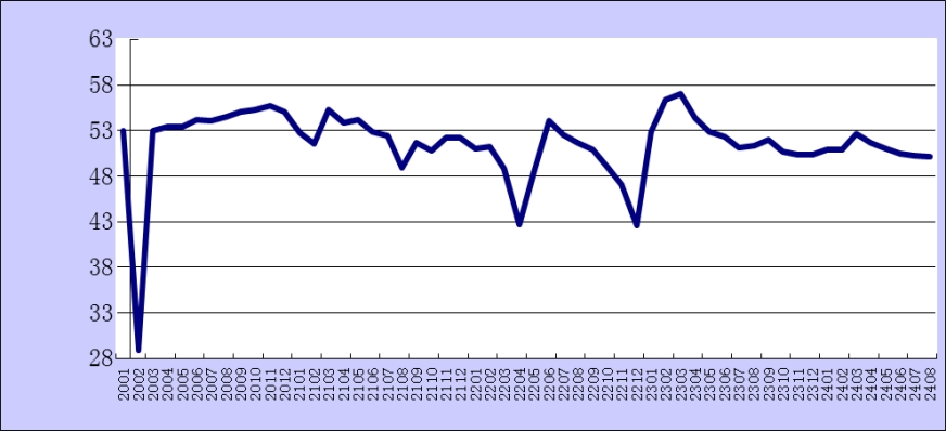 其中,2024年8月份,制造業生產指數為49.8%,較上月下降0.3個百分點;非制造業商務活動指數為50.3%,較上月上升0.1個百分點。