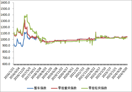 分車型看,各車型指數環比小幅回升。其中,整車指數為1048.69點,比上周回升0.19%;零擔輕貨指數為1028.62點,比上周回升0.02%;零擔重貨指數為1049.02點,比上周回升0.26%。