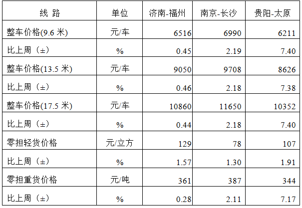 分車型看,各車型指數環比小幅回升。其中,整車指數為1062.89點,比上周回升1.28%;零擔輕貨指數為1042.42點,比上周回升1.29%;零擔重貨指數為1062.67點,比上周回升1.29%。