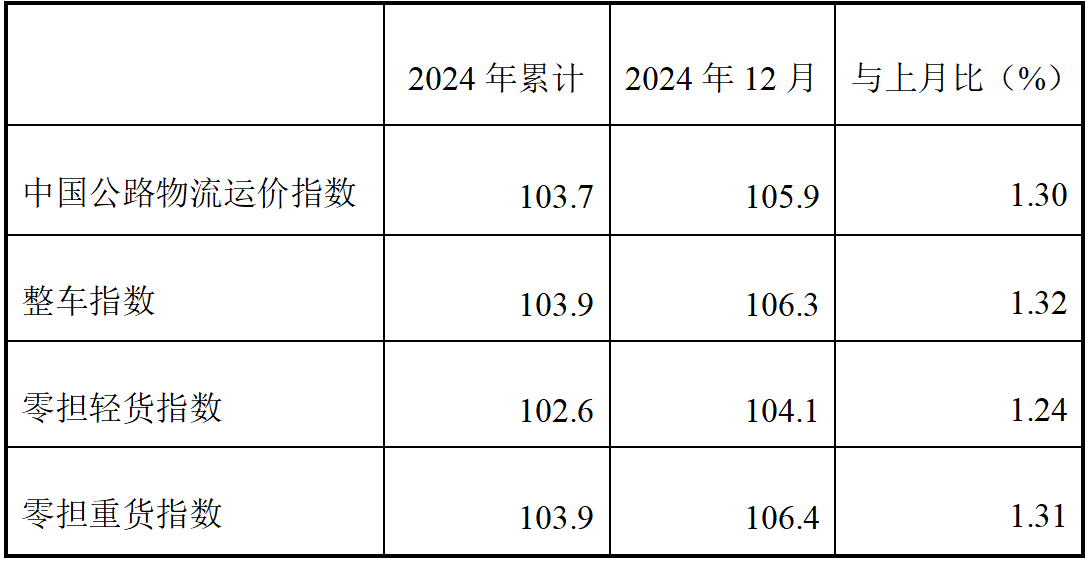 表1 2024年12月中國公路物流運(yùn)價(jià)指數(shù)表