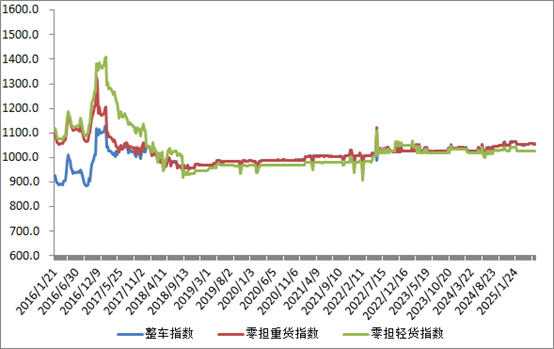 分車型看,各車型指數(shù)環(huán)比漲跌互現(xiàn)。其中,整車指數(shù)為1055.37點(diǎn),比上周回升0.07%;零擔(dān)輕貨指數(shù)為1026.11點(diǎn),比上周回落0.03%;零擔(dān)重貨指數(shù)為1055.13點(diǎn),比上周回落0.06%。