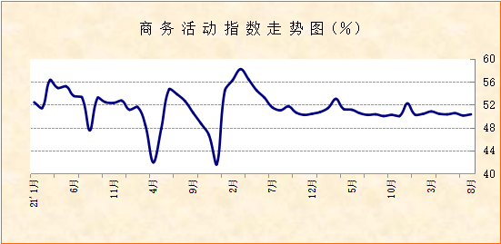 雨季持續影響建筑業增速,基礎建設活動保持擴張。8月,在雨季持續影響下,建筑業增速繼續放緩,建筑業商務活動指數連續2個月環比下降,且降至50%以下。分行業看,房屋建筑業和建筑裝飾業均在收縮區間,土木工程建筑業保持在擴張區間。土木工程建筑業商務活動指數雖連續3個月環比下降,但仍在53%以上,顯示基礎建設相關活動保持較快增長態勢。預期進入四季度,隨著天氣影響減弱,建筑業相關活動將迎來集中釋放期。
