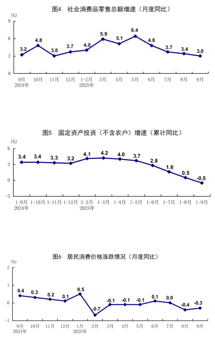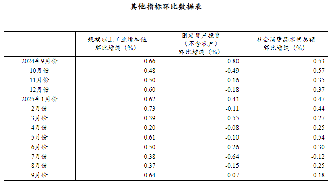 (2)根據季節調整模型自動修正結果,對近一年來各期國內生產總值、規模以上工業增加值、固定資產投資(不含農戶)、社會消費品零售總額環比增速進行修訂。修訂結果及2025年三季度GDP環比數據、2025年9月份其他指標環比數據如下: