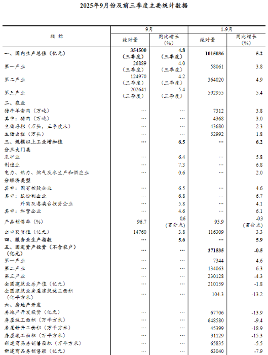 初步核算,前三季度國內生產總值1015036億元,按不變價格計算,同比增長5.2%。分產業看,第一產業增加值58061億元,同比增長3.8%;第二產業增加值364020億元,增長4.9%;第三產業增加值592955億元,增長5.4%。分季度看,一季度國內生產總值同比增長5.4%,二季度增長5.2%,三季度增長4.8%。從環比看,三季度國內生產總值增長1.1%。