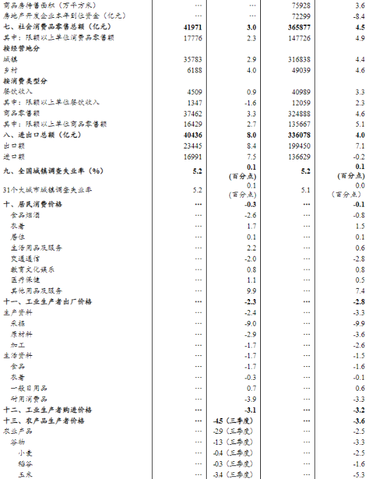 前三季度,全國固定資產投資(不含農戶)371535億元,同比下降0.5%;扣除房地產開發投資,全國固定資產投資增長3.0%。分領域看,基礎設施投資同比增長1.1%,制造業投資增長4.0%,房地產開發投資下降13.9%。全國新建商品房銷售面積65835萬平方米,同比下降5.5%;新建商品房銷售額63040億元,下降7.9%。分產業看,第一產業投資同比增長4.6%,第二產業投資增長6.3%,第三產業投資下降4.3%。民間投資同比下降3.1%;扣除房地產開發投資,民間投資增長2.1%。高技術產業中,信息服務業,航空、航天器及設備制造業,計算機及辦公設備制造業投資同比分別增長33.1%、20.6%、7.4%。9月份,固定資產投資(不含農戶)環比下降0.07%。
