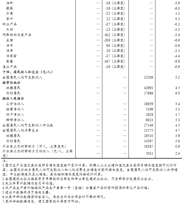 前三季度,全國居民人均可支配收入32509元,同比名義增長5.1%,扣除價格因素實際增長5.2%。按常住地分,城鎮居民人均可支配收入42991元,同比名義增長4.4%,實際增長4.5%;農村居民人均可支配收入17686元,同比名義增長5.7%,實際增長6.0%。從收入來源看,全國居民人均工資性收入、經營凈收入、財產凈收入、轉移凈收入分別名義增長5.4%、5.3%、1.7%、5.3%。全國居民人均可支配收入中位數27149元,同比名義增長4.5%。