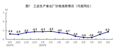 前三季度,全國工業生產者出廠價格同比下降2.8%。其中,9月份同比下降2.3%,降幅比上月收窄0.6個百分點,環比持平。前三季度,工業生產者購進價格同比下降3.2%。其中,9月份同比下降3.1%,降幅比上月收窄0.9個百分點,環比上漲0.1%。