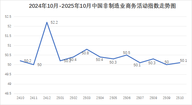 國家統計局服務業調查中心、中國物流與采購聯合會發布的2025年10月份中國非制造業商務活動指數為50.1%,環比上升0.1個百分點。由于非制造業沒有綜合指數,通常以商務活動指數來反映非制造業經濟的總體變化。
