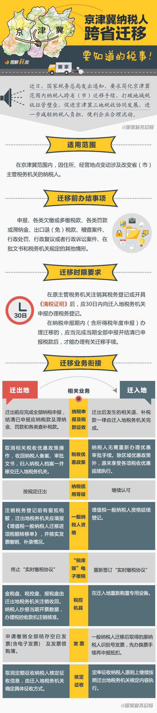 通知明確,京津冀范圍內,納稅人因住所、經營地點變動涉及改變主管稅務機關的,簡化遷移手續。通知要求,納稅人在納稅申報期內(含所得稅年度申報),提出辦理遷移的,在完成當期全部申報并結清已申報稅款后,不需要經過清算,可以辦理有關遷移手續。納稅人在原主管稅務機關注銷其稅務登記或開具《清稅證明》后,30日內向遷入地稅務機關申報辦理稅務登記。通知還就增值稅一般納稅人和新設立的“一照一碼”戶遷移等做了具體要求。