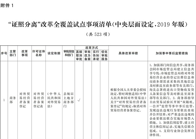 附件:1.“證照分離”改革全覆蓋試點(diǎn)事項(xiàng)清單(中央層面設(shè)定,2019年版)
