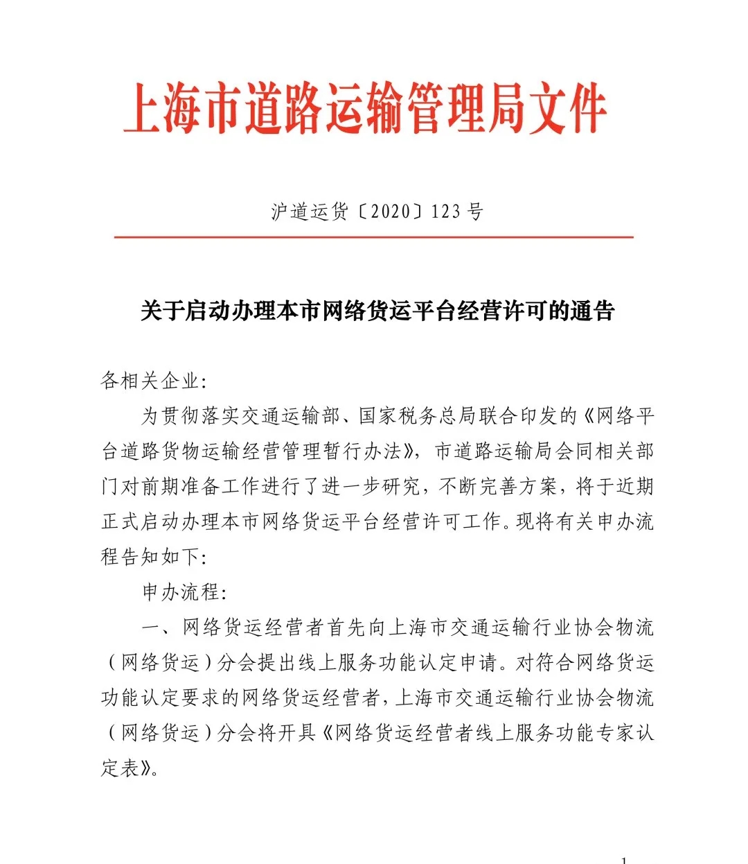 上海市道路運(yùn)輸管理局關(guān)于啟動辦理本市網(wǎng)絡(luò)貨運(yùn)平臺經(jīng)營許可的通告