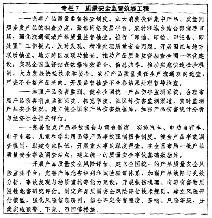 (二十七)優(yōu)化質(zhì)量監(jiān)管效能。健全以“雙隨機(jī)、一公開”監(jiān)管和“互聯(lián)網(wǎng)+監(jiān)管”為基本手段、以重點(diǎn)監(jiān)管為補(bǔ)充、以信用監(jiān)管為基礎(chǔ)的新型監(jiān)管機(jī)制。創(chuàng)新質(zhì)量監(jiān)管方式,完善市場準(zhǔn)入制度,深化工業(yè)產(chǎn)品生產(chǎn)許可證和強(qiáng)制性認(rèn)證制度改革,分類放寬一般工業(yè)產(chǎn)品和服務(wù)業(yè)準(zhǔn)入限制,強(qiáng)化事前事中事后全鏈條監(jiān)管。對涉及人民群眾身體健康和生命財(cái)產(chǎn)安全、公共安全、生態(tài)環(huán)境安全的產(chǎn)品以及重點(diǎn)服務(wù)領(lǐng)域,依法實(shí)施嚴(yán)格監(jiān)管。完善產(chǎn)品質(zhì)量監(jiān)督抽查制度,加強(qiáng)工業(yè)品和消費(fèi)品質(zhì)量監(jiān)督檢查,推動(dòng)實(shí)現(xiàn)生產(chǎn)流通、線上線下一體化抽查,探索建立全國聯(lián)動(dòng)抽查機(jī)制,對重點(diǎn)產(chǎn)品實(shí)施全國企業(yè)抽查全覆蓋,強(qiáng)化監(jiān)督抽查結(jié)果處理。建立健全產(chǎn)品質(zhì)量安全風(fēng)險(xiǎn)監(jiān)控機(jī)制,完善產(chǎn)品傷害監(jiān)測體系,開展質(zhì)量安全風(fēng)險(xiǎn)識別、評估和處置。建立健全產(chǎn)品質(zhì)量安全事故強(qiáng)制報(bào)告制度,開展重大質(zhì)量安全事故調(diào)查與處理。健全產(chǎn)品召回管理體制機(jī)制,加強(qiáng)召回技術(shù)支撐,強(qiáng)化缺陷產(chǎn)品召回管理。構(gòu)建重點(diǎn)產(chǎn)品質(zhì)量安全追溯體系,完善質(zhì)量安全追溯標(biāo)準(zhǔn),加強(qiáng)數(shù)據(jù)開放共享,形成來源可查、去向可追、責(zé)任可究的質(zhì)量安全追溯鏈條。加強(qiáng)產(chǎn)品防偽監(jiān)督管理。建立質(zhì)量安全“沙盒監(jiān)管”制度,為新產(chǎn)品新業(yè)態(tài)發(fā)展提供容錯(cuò)糾錯(cuò)空間。加強(qiáng)市場秩序綜合治理,營造公平競爭的市場環(huán)境,促進(jìn)質(zhì)量競爭、優(yōu)勝劣汰。嚴(yán)格進(jìn)出口商品質(zhì)量安全檢驗(yàn)監(jiān)管,持續(xù)完善進(jìn)出口商品質(zhì)量安全風(fēng)險(xiǎn)預(yù)警和快速反應(yīng)監(jiān)管機(jī)制。加大對城鄉(xiāng)結(jié)合部、農(nóng)村等重點(diǎn)區(qū)域假冒偽劣的打擊力度。強(qiáng)化網(wǎng)絡(luò)平臺銷售商品質(zhì)量監(jiān)管,健全跨地區(qū)跨行業(yè)監(jiān)管協(xié)調(diào)聯(lián)動(dòng)機(jī)制,推進(jìn)線上線下一體化監(jiān)管。