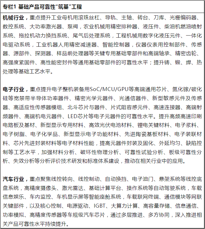 聚焦機械、電子、汽車等行業,實施基礎產品可靠性“筑基”工程,筑牢核心基礎零部件、核心基礎元器件、關鍵基礎軟件、關鍵基礎材料及先進基礎工藝的可靠性水平。實施整機裝備與系統可靠性“倍增”工程,促進可靠性增長。強化可靠性指標考核與評價,在產業基礎再造和制造業高質量發展等專項實施和相關標準制修訂中,強化可靠性攻關及創新成果評價與轉化應用,倒逼可靠性不達標的產品退出市場。(工業和信息化部、科技部、市場監管總局等按職責分工負責)