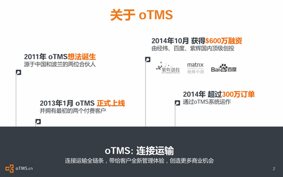 2015年4月21日,oTMS 在京舉辦了產(chǎn)品體驗會,oTMS 聯(lián)合創(chuàng)始人及首席運營官段琰展示了國內(nèi)第一家真正的社區(qū)型運輸管理平臺——oTMS(open Transport Management System)解決方案。該方案將互聯(lián)網(wǎng)思維與傳統(tǒng)物流運輸行業(yè)有機結(jié)合,采用“SaaS 平臺+移動App”模式,連接貨運鏈條中的各方,使之形成一個基于核心流程的、平衡的、多贏的在線生態(tài)系統(tǒng),從而構(gòu)建完整的、互聯(lián)的運輸世界,在“互聯(lián)網(wǎng)+”時代改造傳統(tǒng)運輸產(chǎn)業(yè)鏈,加速產(chǎn)業(yè)進化。