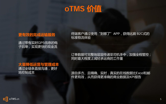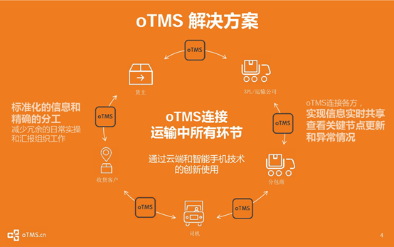 對此,oTMS創(chuàng)造性地將互聯(lián)網(wǎng)思維與傳統(tǒng)物流運輸行業(yè)相結(jié)合,提出了“運輸互聯(lián)”的理念——通過“SaaS平臺+移動App”的模式連接運輸,將貨運環(huán)節(jié)中的貨主、第三方物流公司、運輸公司、司機和收貨方無縫連接起來,打造一個基于核心流程的、透明開放的生態(tài)系統(tǒng)。