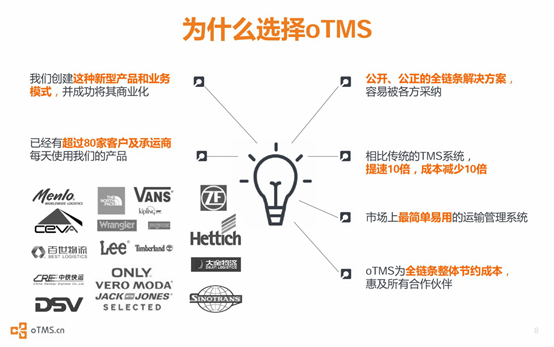 oTMS運輸互聯(lián)解決方案憑借其創(chuàng)新的互聯(lián)網(wǎng)模式,兩年內(nèi)便贏得130多家客戶的青睞。服裝客戶綾致時裝(Jack&Jones, Only, Vero Moda, Selected)通過使用oTMS ,把2個全國物流中心、28個區(qū)域物流中心、7000多家門店以及外部的30多家物流公司連接起來,全部訂單在線傳輸、在線追蹤反饋、電子回單、電子賬單以及逐步推進中的握手交接,實現(xiàn)運輸全程無紙化。使得綾致的運輸全程更加透明,提升內(nèi)部管理效率的同時,也大量降低了運營與管理成本,向終端客戶提供更好的服務(wù)體驗。