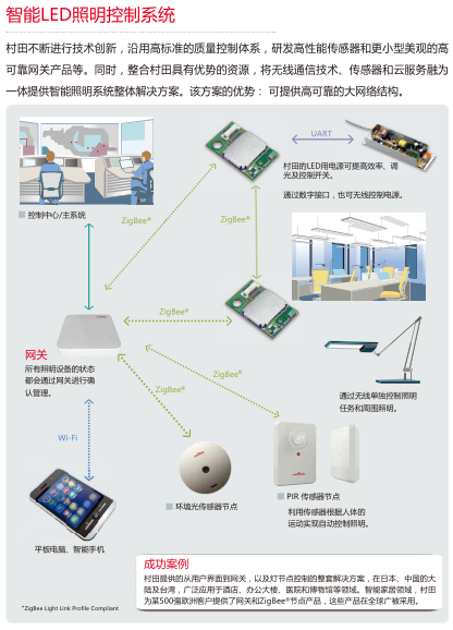在IoT領(lǐng)域,村田推出了“智能照明系統(tǒng)解決方案”,將先進(jìn)的無(wú)線(xiàn)通信技術(shù)、傳感器和云服務(wù)融入到整個(gè)照明解決方案,形成了高可靠的大網(wǎng)絡(luò)結(jié)構(gòu),實(shí)現(xiàn)“人走燈滅”、節(jié)能環(huán)保的目的,最大限度地節(jié)約能源。用戶(hù)還可基于場(chǎng)景、時(shí)間、區(qū)域同時(shí)控制不同種類(lèi)的燈光,實(shí)現(xiàn)更舒適溫馨的生活空間。在日本、中國(guó)大陸及臺(tái)灣,村田提供的從用戶(hù)界面到網(wǎng)關(guān),以及燈節(jié)點(diǎn)控制的整套解決方案,被廣泛地應(yīng)用于酒店、辦公大樓、 醫(yī)院等眾多機(jī)構(gòu)。