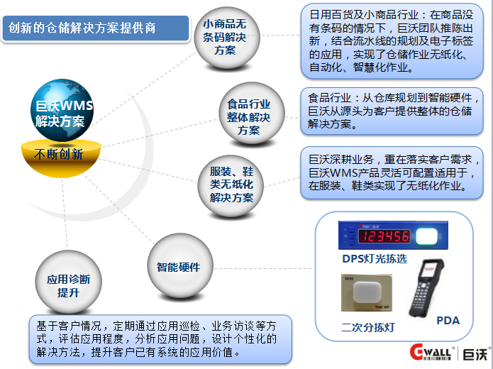 巨軟科技公司擁有知名品牌“巨沃”,主要產(chǎn)品包括:WMS(倉儲管理系統(tǒng))、OMS(訂單管理系統(tǒng))、BMS(計費管理系統(tǒng))、WCS(倉儲控制系統(tǒng)),DPS燈光揀選系統(tǒng),巨沃還擁有自主研發(fā)的硬件產(chǎn)品,包括“電子標簽”“RFID”等。