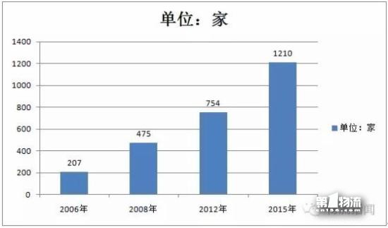 經(jīng)核實,截至本次調(diào)查結(jié)束,全國包括運(yùn)營、在建和規(guī)劃的各類物流園區(qū)共計1210家,比2006年的207家增長484%;與2008年的475家相比,增長155%;與2012年的754家相比,增長60%。如下圖所示: