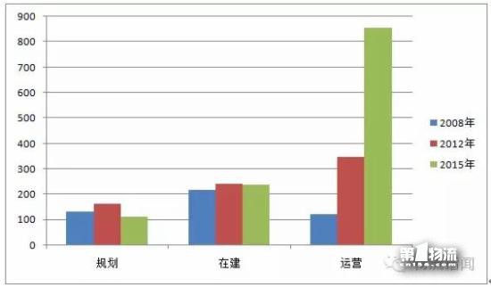 與前兩次全國物流園區(qū)調(diào)查數(shù)據(jù)相比,本次處于運(yùn)營狀態(tài)的物流園區(qū)數(shù)量大幅上升,由2012年的348家上升至2015年的857家。處于在建狀態(tài)的物流園區(qū)的數(shù)量與2012年基本持平。如下圖所示: