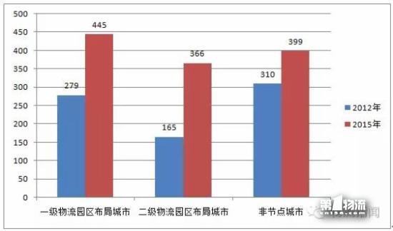 根據(jù)《全國物流園區(qū)發(fā)展規(guī)劃(2013—2020年)》,我們對所確定的物流園區(qū)布局節(jié)點(diǎn)城市進(jìn)行分析。本次調(diào)查顯示,近三年來國家規(guī)劃的節(jié)點(diǎn)城市物流園區(qū)數(shù)量增長較快,其中一級物流園區(qū)節(jié)點(diǎn)城市的園區(qū)數(shù)量由2012年的279家增長到2015年的445家;二級物流園區(qū)節(jié)點(diǎn)城市的園區(qū)數(shù)量從2012年的165家增長到2015年的366家。