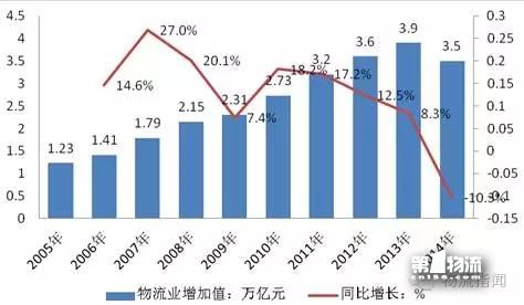 2014年,我國物流業(yè)增加值3.5萬億元,可比增長9.5%,保持較快增長,其中,交通運(yùn)輸業(yè)增加值2.4萬億元,可比增長8.3%,貿(mào)易物流業(yè)增加值6781億元,可比增長7.9%,倉儲業(yè)和郵政物流業(yè)增加值分別增長4.8%和35.6%。