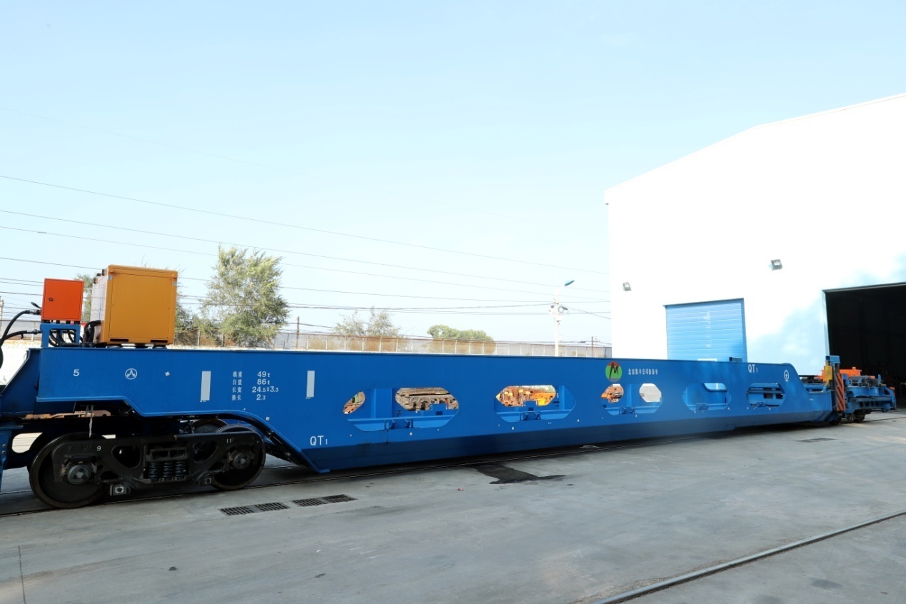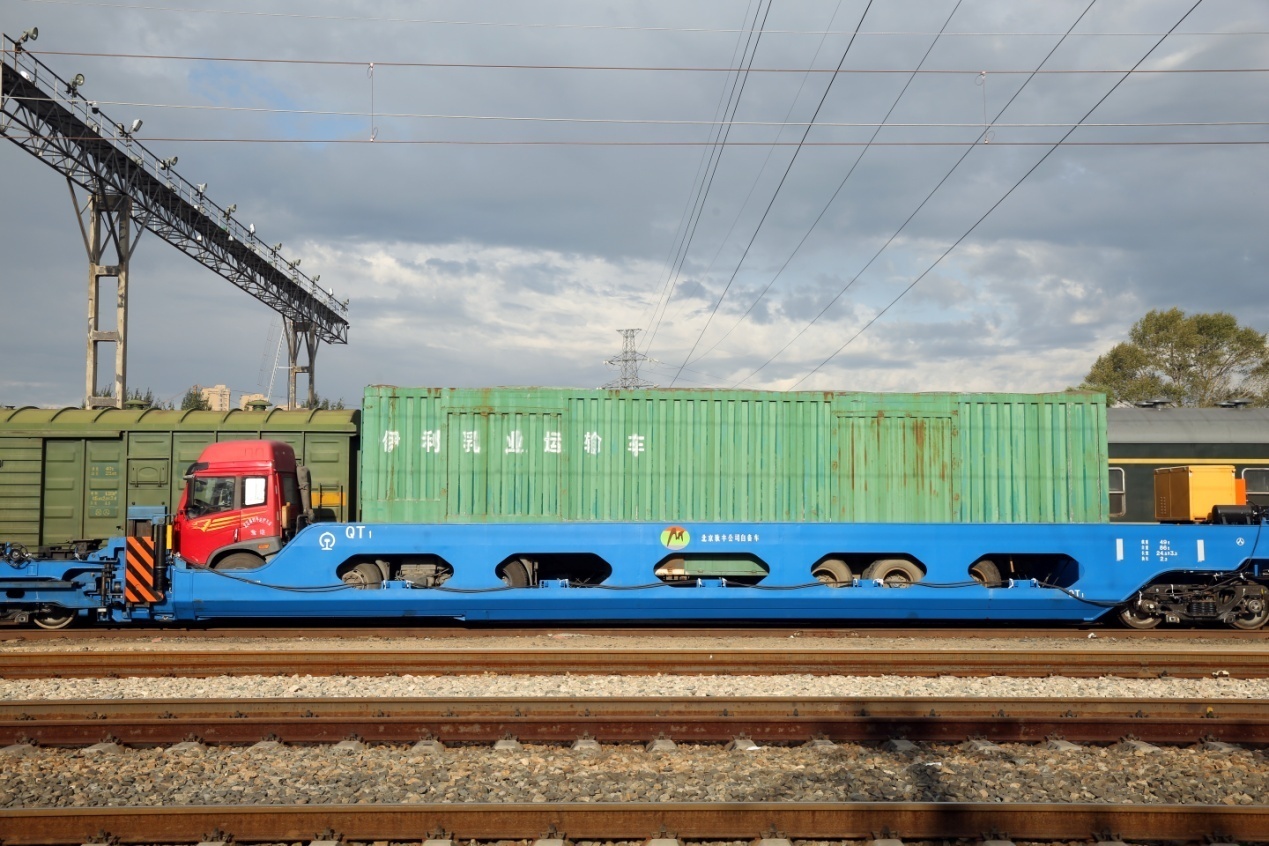 我國第一代多式聯運公鐵馱背運輸專用車是由北京馱豐高新科技股份有限公司歷時五年在國內外開展調研、論證的基礎上與中車齊齊哈爾車輛有限公司強強聯手共同研制的我國新型公鐵聯運裝備。QT1型馱背運輸車用于公路汽車整車或半掛車運輸,QT2型馱背運輸車專用于公路半掛車甩掛運輸。這兩種車型能夠充分利用我國鐵路站場設施,滿足公路貨車整車、半掛車自行上下馱背車的要求,滿足由鐵路完成中長距離運輸及“門到門”服務的運輸市場需求。以降低我國陸路貨運能耗,降低社會物流成本,減少污染,改善公路擁堵,促進公路運輸業秩序化,是現代運輸業高效、安全、快捷、節能環保、綠色低碳、大運量、全天候的最佳交通運輸方式之一,具有廣闊的發展前景和顯著的社會效益和經濟效益。