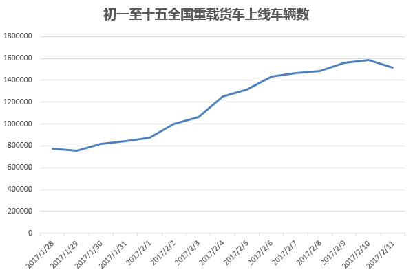 而在元宵團圓佳節當天,重載貨車上線數略有下降,但依然維持在150萬輛的較高水平。預計元宵節后,重載貨車運營數量將繼續增加,全國重要道路車流量將迎來高峰。