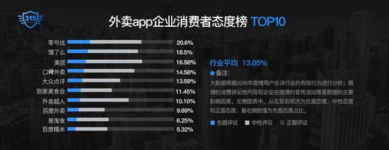 零號線、餓了么、美團、口碑外賣、大眾點評、到家美食會、外賣招人、百度外賣、易淘食、百度糯米位列315消費者態(tài)度榜前十名。其中,零號線負面評議最多,高達20.6%,餓了么繼去年央視315上榜后再次上榜,負面評議達18.5%。