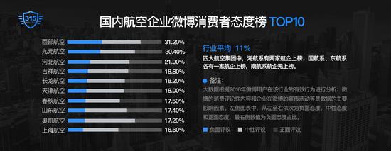 數據表明,微博消費者負面評議達11%。四大航空集團中,海航系旗下西部航空、天津航空上榜,西部航空更是以31.2%的負面評議位居315消費者態(tài)度榜首位。國航系旗下山東航空上榜,負面評議達17.4%。東航系旗下上海航空上榜,負面評議為16.6%。此外,吉祥航空、春秋航空兩家上市航企也在315消費者態(tài)度榜之列。九元航空、河北航空、長龍航空、奧凱航空均登上榜單前十名。