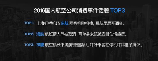 2016年,最熱議的三大事件分別是上海虹橋機場東航兩客機險相撞,民航局展開調查;海航航班情人節(jié)被取消,兩單身女孩被安排住情趣房;祥鵬航空機長不滿航班遭插隊,呼吁乘客在停機坪踢鍵子抗議。