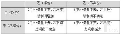 如上圖所示,四象限圖中快遞企業按照漲價和不漲價可以出現四種不同的結果: