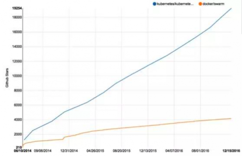 據(jù) GitHub 跟蹤統(tǒng)計(jì),Kubernetes 代碼貢獻(xiàn)數(shù)量超過 Mesos 三倍以上;另一方面,在 GitHub Star 的熱度對(duì)比圖中, Kubernetes 也遠(yuǎn)超 Swarm。