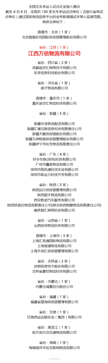 日前,交通運輸部監測平臺公示了全國無車承運人試點企業的接入情況,并公布了全國共130家無車承運試點單位(含部分省級試點單位)中通過國家物流信息平臺的業務聯調測試并納入監測范圍的企業名單,其中江西只有萬佶物流(攜運物聯誠信交易平臺)一家企業上榜。