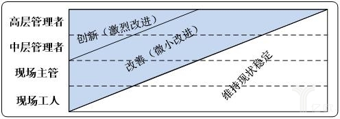 維持系統現狀主要由現場工人、現場主管來完成;而改進系統則主要由中高層管理者來完成。創新是劇烈的改進,需要高層管理者進行投資,將新技術、新設備投入到系統中。改善是微小的改進,需要所有人員堅持不懈的努力,使得系統運行的狀況越來越好。維持系統的現狀穩定,是企業經營管理對企業所有人員的基本要求,每個人都必須盡職盡責。