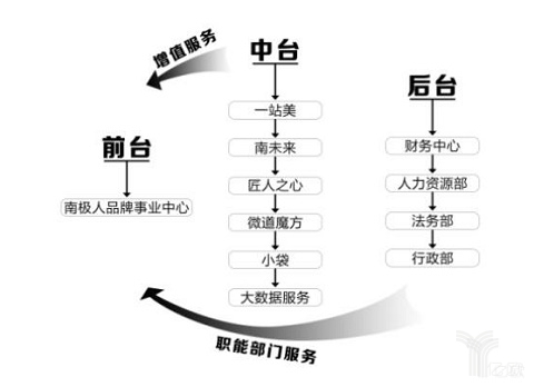 前臺為品牌事業中心,負責品牌電商業務;中臺為各增值服務部門,負責服務電商業務;后臺為集團支撐部門與管理部門。
