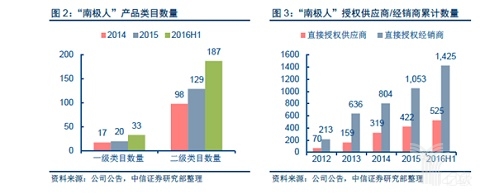 其一、模式方面:輕資產平臺化運營,發展速度快。南極電商公司,經營南極人共同體這個供銷平臺,南極電商財報,截至2015年12月31日,南極人共同體(NGTT)內的授權供應商達422家,授權經銷商達1,053家。供銷兩端經營好,知名品牌在網絡渠道就非常好銷售。