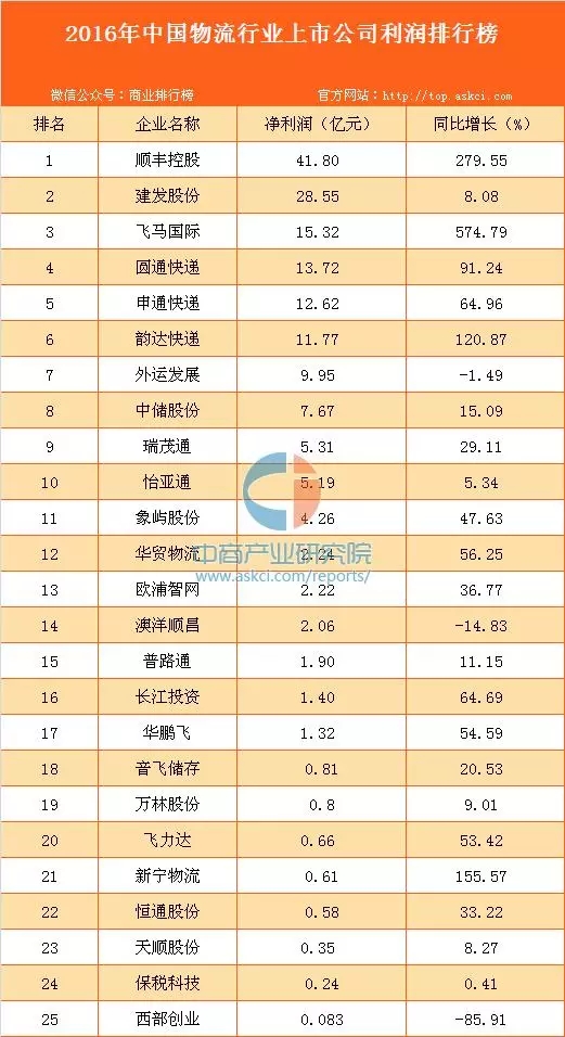最新排行:2016年中國物流行業上市公司利潤排行榜