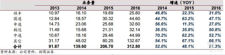 2016年,順豐、圓通、申通、韻達、中通業務量分別為25.8(+31%)、44.6(+47.1%)、32.6(+27%)、32.14(+50.8%)和44.99(+52.7%)億件,中通成為五大快遞企業中唯一一家增速超過行業均值(51%)的企業,市占率躍居行業首位。