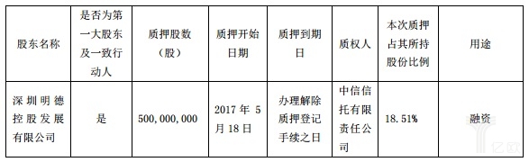 5月20日,順豐控股(002352)公告稱,其控股股東深圳明德控股發(fā)展有限公司向中信信托有限責(zé)任公司抵押5.00億股公司股份,用途為“融資”。