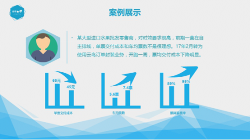 云鳥科技的預約排線運力中心是全國集約的、標準化整合解決方案,API對接則是云鳥科技提升效率、幫客戶降低成本的重要途徑。信蘋舉了一個實例:一位做大型水果批發零售的客戶,在采用了云鳥科技的一站式的服務后,單票成本從65降到了45,裝載率5.6%提升到了7.4%。API對接加速信息流動,客戶的訂單和運單傳到系統,通過排線運力中心排線調度,效率自然會大幅度提升。