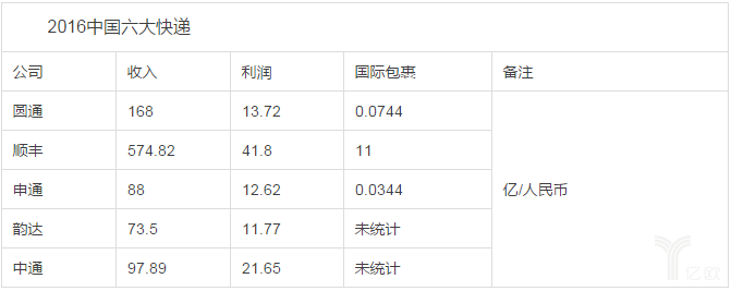 其中順豐全年收入574.82,2016年國際收入11億,可以說是幾家國內上市快遞企業里國際業務做得最好的,順豐2015年國際收入才兩億左右,國際業務增長率也是最高的。但是國際收入在順豐總體收入中占比也僅為1.9%,和國際快遞巨頭30%以上的收入占比來看,都還有巨大的增長空間。