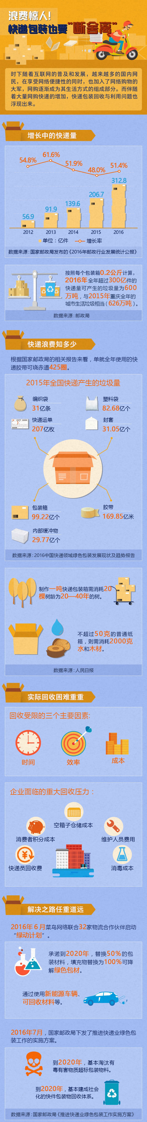 近年來隨著網絡購物快速發展,快遞業呈現爆炸式增長。《2016年郵政行業發展統計公報》顯示,快遞服務企業2016年業務量達312億件,連續6年年均增長超50%。