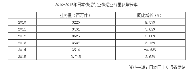 快遞物流是日本物流行業的主要市場之一。2015年日本快遞業務量達到37.45億件,按日本人口數1.3億計算,日本人均每年約28件快件;從2010—2015年4年間平均每年以4.0%的增速增長,日本快遞行業基本飽和.快遞業務量增長緩慢。