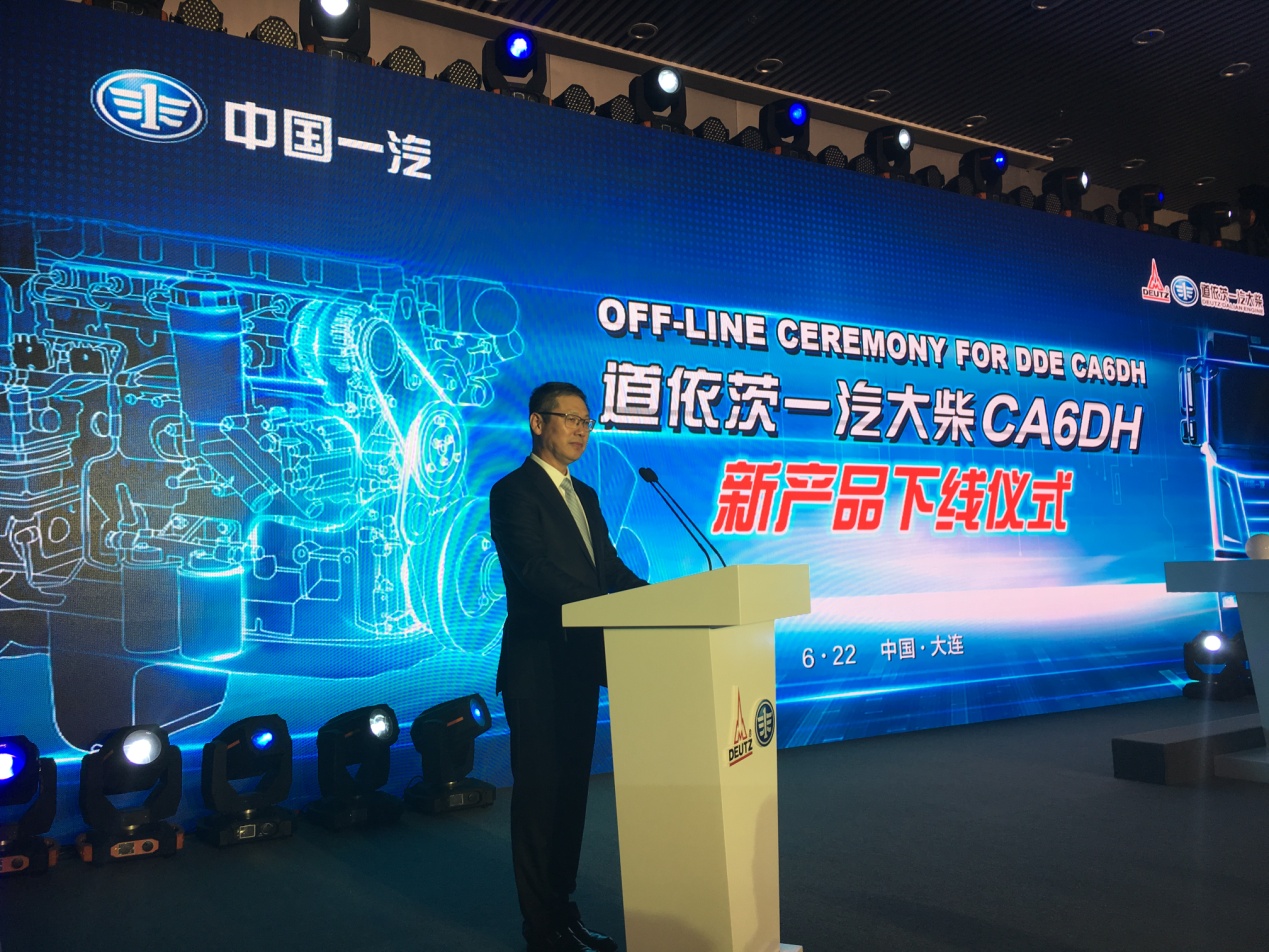 下線儀式由道依茨一汽大柴副總經理黃南翔主持,道依茨一汽大柴總經理席慕思先生首先致歡迎詞,一汽解放公司總經理、黨委書記胡漢杰先生發(fā)表重要講話。道依茨一汽大柴研發(fā)部部長Kaiser先生和道依茨一汽大柴質量保證部部長Aras先生分別進行產品和品質管理方面的介紹。之后,在現(xiàn)場所有嘉賓的共同見證下,主要領導共同為新產品揭幕,標志著為滿足最新排放標準而研制開發(fā)的6DH新產品正式下線。這也標志著在國家全面實施國五排放法規(guī)之際,道依茨一汽大柴將憑借這一全新產品搶抓機遇、引領市場。