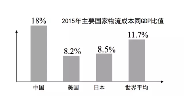 在上圖中我們知道,中國物流成本占GDP的比例高達18%,而同時發達國家則將這一比例控制在8%左右,其中美國為8.2%,日本為8.5%,世界平均水平在11.7%,即中國的物流成本是在世界水平線之下的,有巨大的提升空間。
