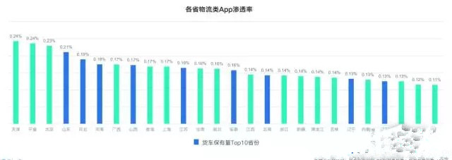 (1)分布情況。據數據計算,貨車保有量Top10省份(即藍色柱狀圖標注的省份)的貨運汽車數量總和為794萬,而按照各省物流類App滲透率的Top10來計算貨運汽車總和為521萬輛,差額273萬量,占全國貨運汽車總量的近20%。