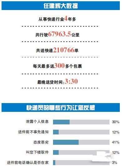 《全國社會化電商物流從業人員研究報告》顯示,90%以上的快遞員每天要工作8小時以上,三成男性快遞員日均工作12小時以上。高強度的工作伴隨著巨大的壓力,上述調查結果顯示,70%以上的快遞員表示壓力很大。四年時間,每天都在重復同樣的工作,在任建輝的眼中,快遞員工作只要送好貨,耐心點,多勞多得,簡單。如果用時下流行的大數據來表現,輝哥已經派送了210766單,行駛了67963.5公里,也可以繞著赤道一圈半了,而收獲四個評價的關鍵詞則是態度好、火箭哥、小哥帥氣、熱心腸!而工作至今,任建輝也一直保持著每月顧客滿意度和妥投率評估99%的滿意度。2017年已經過去一多半,任建輝和他帶領的團隊也一直保持著0投訴的好成績。
