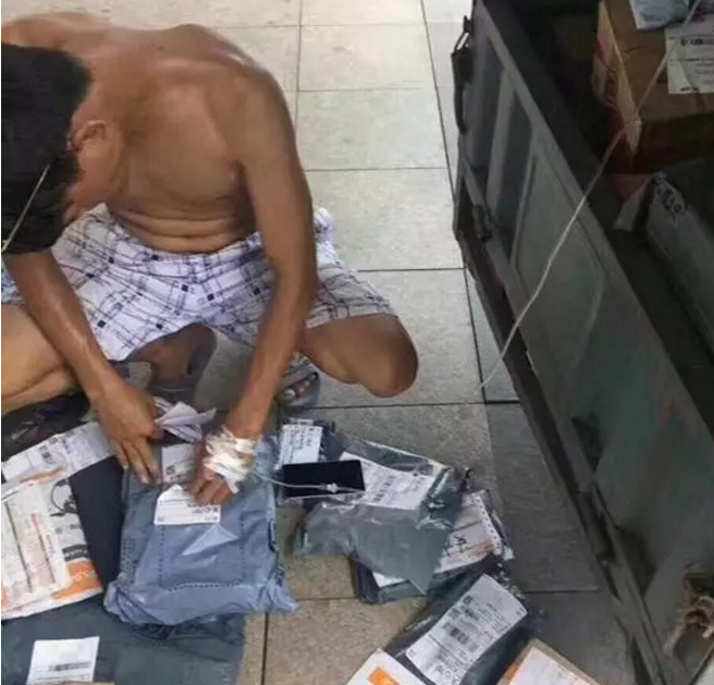 ◎7月25日,長沙一名快遞員邊輸液邊送貨。據快遞員自己說,他前兩天就中暑了,扛到今天才去醫院,但是又怕耽誤送快遞被投訴,只有邊打點滴邊送;